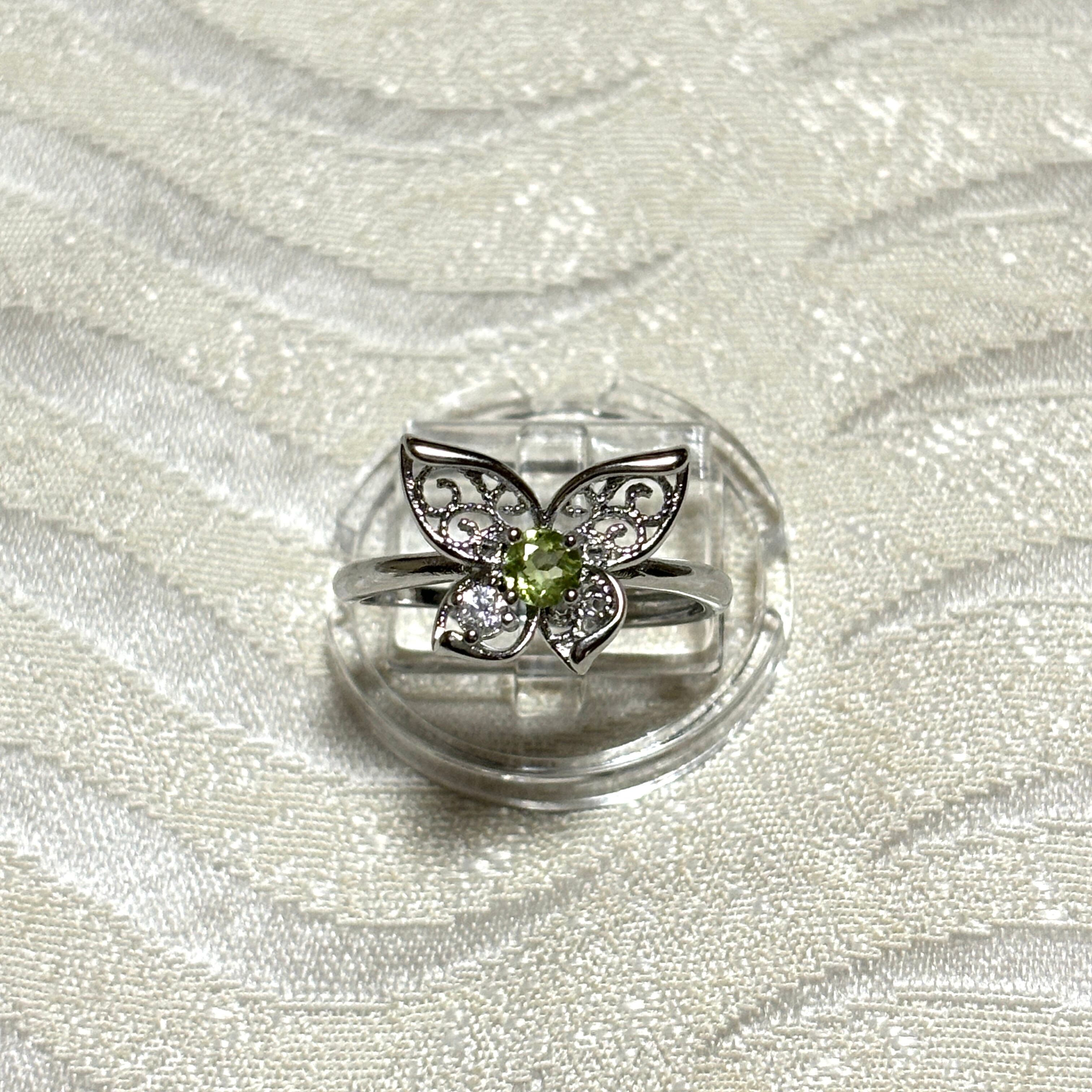 【検索ワード】天然石リング フリーサイズリング ペリドット 蝶モチーフ 真鍮製クリスタル 癒し ポジティブエネルギー